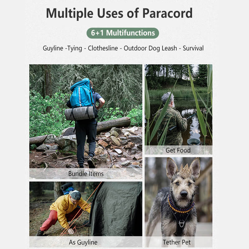LINEVI Paracord's versatility is highlighted through its 6+1 Multifunctions. It serves as an efficient Guyline for securing tents and shelters, a reliable tool for tying items together, and even transforms into a clothesline for drying clothes during outdoor adventures. The cord's adaptability extends to functioning as an Outdoor Dog Leash, proving its reliability in unexpected situations.
